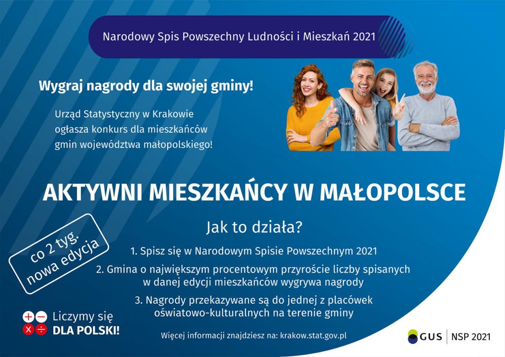 Urząd Statystyczny w Krakowie ogłasza konkurs dla mieszkańców gmin województwa małopolskiego „Aktywni mieszkańcy w Małopolsce”. Głównym celem konkursu jest promocja NSP 2021 oraz zachęcenie mieszkańców województwa małopolskiego do aktywnego i licznego uczestnictwa w spisie.