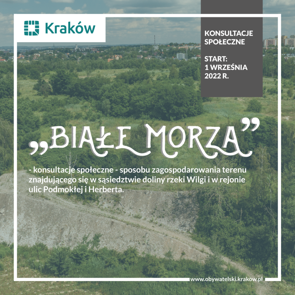 Wydział Polityki Społecznej i Zdrowia uprzejmie informuje, iż w dniu 1 września br. rozpoczną się konsultacje społeczne z mieszkańcami dotyczące sposobu zagospodarowania terenu znajdującego się w sąsiedztwie doliny rzeki Wilgi i w rejonie ulic Podmokłej i Herberta pn. „Białe Morza”.