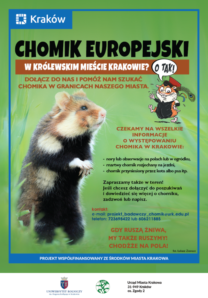 Zapraszamy mieszkańców Krakowa do zgłaszania miejsc występowania chomika europejskiego oraz do czynnego uczestnictwa w inwentaryzacji tego gatunku. Szczegóły znajdują się na plakacie.