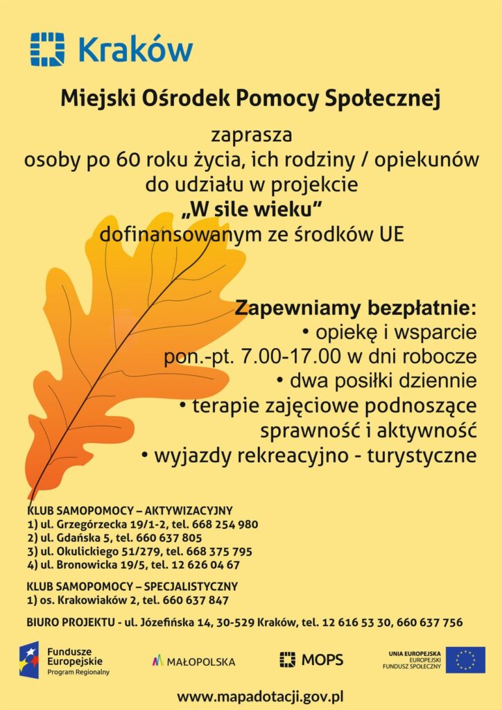 Miejski Ośrodek Pomocy Społecznej w Krakowie od 1.03.2017 r. do dnia 28.02.2020 r. realizuje projekt pn.: „W sile wieku”, finansowany przez Unię