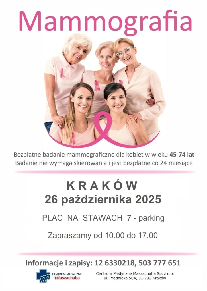 Zapraszamy do skorzystania z bezpłatnego badania mammograficznego. Nie wymaga skierowania i jest bezpłatne co 24 miesiące. Więcej szczegółów po kliknięciu