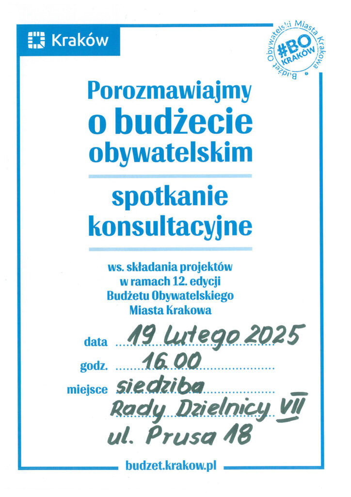 Zapraszamy na spotkanie konsultacyjne w sprawie budżetu obywatelskiego – 19 lutego 2025 o godzinie 16:00 w siedzibie Rady Dzielnicy VII
