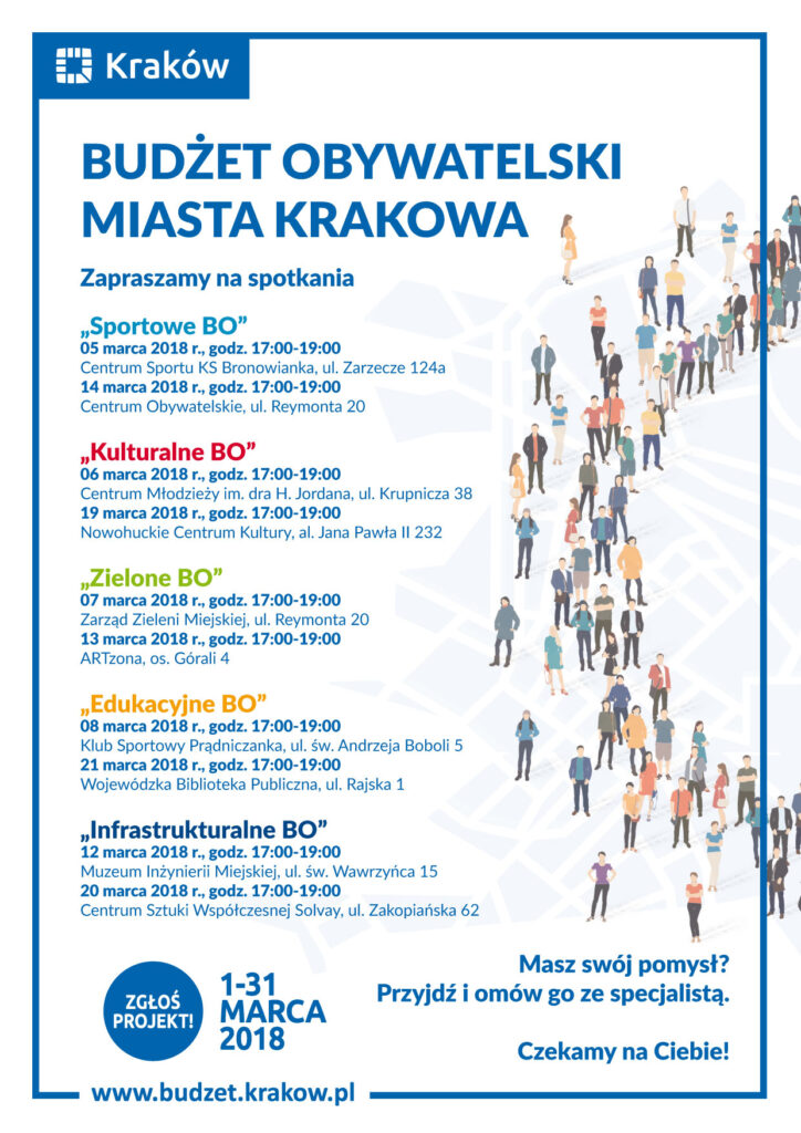 Zapraszamy mieszkańców Krakowa do udziału w spotkaniach informacyjno-konsultacyjnych dotyczących budżetu obywatelskiego miasta Krakowa. „Zielone BO” 07 marca 2018 r., godz.
