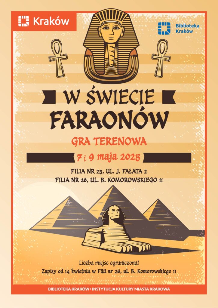 Zapraszamy na terenową grę „W świecie faraonów”. Już 7 i 9 maja 2025 roku. Szczegóły po kliknięciu w plakat