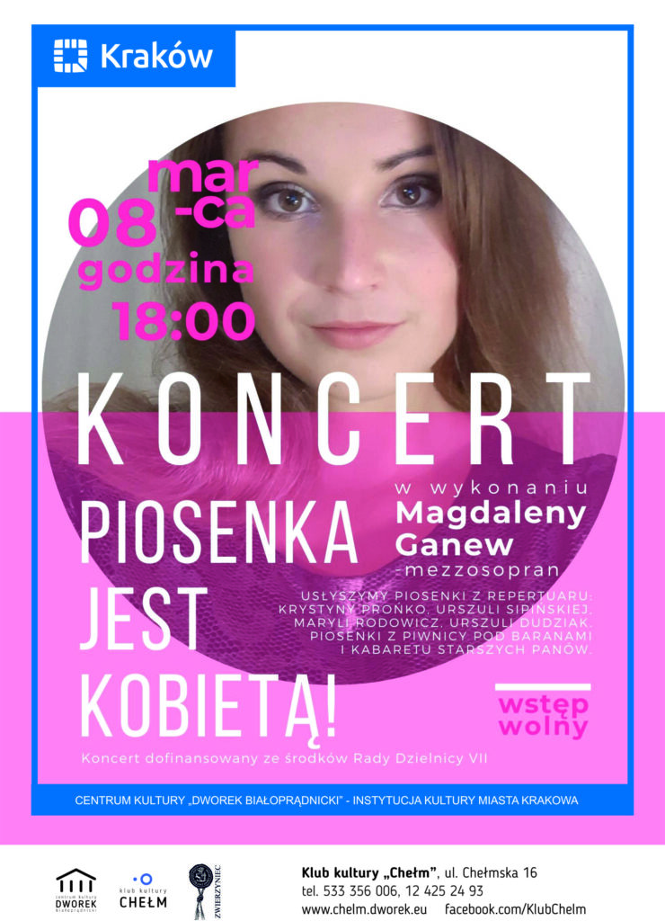 Piosenka jest Kobietą! Koncert w wykonaniu Magdaleny Ganew- mezzosopran przy akompaniamencie Władysława Borowicza. Koncert odbędzie się w Klubie Kultury Chełm,